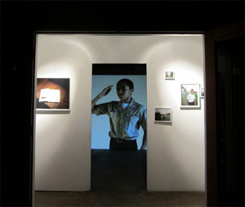 In the film-loop Sharrod (Turn/Twirl) the subject is recorded as he turns 360 degrees while holding himself in the position of salute. In the small room at Krowswork where this was projected, I had the feeling that I was some sort of a clinician watching for the slightest twitch, an authority figure judging the ability of the cadet to maintain his posture. The sheer tedium of this performance becomes a kind of yogic exercise for the watcher–and fascination leads to other emotional responses: pity, respect, horror, consternation. Issues of age, class, gender, race, authority, and tradition flash like little sparks, troubling the surface of appearances. One wonders what the REAL story of this man/child is. How is it that we as a culture give so little thought to the actual lived experiences of those in the armed services? What hopes, impulses, feelings are flowing beneath the crystal surface of Sharrod’s eyes? I was surprised at the compassion this footage elicited in me, not because I felt bad for Sharrod, but because it suddenly became clear to me how much energy all of us exert performing our “selves” in order to manifest that image which the gaze of others has necessitated.