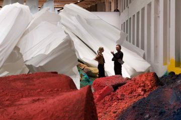 “Katharina Grosse: One Floor Up More Highly” at Mass MoCA. Hated this show the first time I saw it and loved it on the second and third visits. Grosse teaches us, like many artists who work with installation, that an exhibit has to work on you before making a decision about whether or not you “like” it. Spray painting directly onto the walls as well as huge mounds of dirt and Styrofoam, this show had the effect of stepping into another world. And while Grosse sees her work as neither representational or abstract, one couldn’t help associating some elements with massive piles of dried pigment or hyper-enlarged ice crystals. Another thing I really enjoyed was how the installation changed dramatically depending on where you stood in the gigantic space.