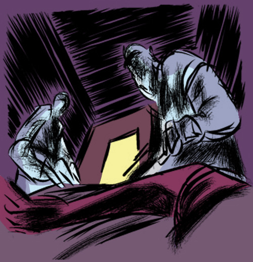 The room was getting worse. The darkness was thick and patches of it would circulate through and sit on my chest. I clawed at the patches and pushed them away. There were voices. I flipped the mattress over to find where they were coming from.