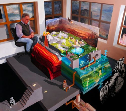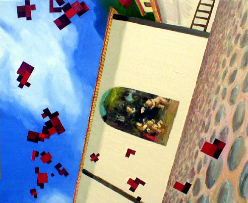In his latest work, Zetterstrand has launched into meta-art. In his paintings he includes traces of the process of painting and sometimes, of the painter himself. Zetterstrand’s The game, 2009, depicts an intersection of a landscape with different layers. It could be interpreted as an intersection of a model of a landscape, and also of an image of the process of creating a digital landscape, when designers are working with different layers as in Photoshop or 3D-programs. The landscape in the painting is also a mixture of 3D and 2D objects with more realistically-painted and pixeleted objects. The painting has many layers: it shows a model placed in a studio, but the windows in the background is not real, the view outside is made of paintings, and so on.