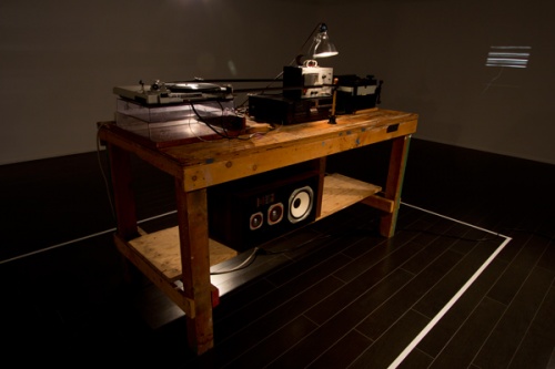 The centerpiece at Eli Ridgway Gallery is a sculptural installation, Monolithoscope, which consists of a 16mm film projector, a turntable and record, stereo amplifiers and speakers, a bio chart reader, and black film leader that runs through these connected devices. On the projected film, one can see a series of moving white lines that are created by the needle of the bio chart reader as it interprets the sound vibrations. From the scratched film, Mauricio created a series of silver gelatin prints.