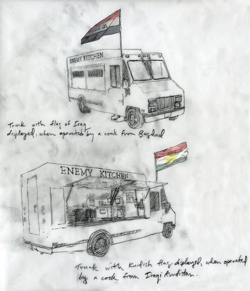 Michael Rakowitz, working sketch for "Enemy Kitchen (Food Truck)," a commission for "Feast," 2011. Courtesy of the artist and Lombard-Freid Projects.