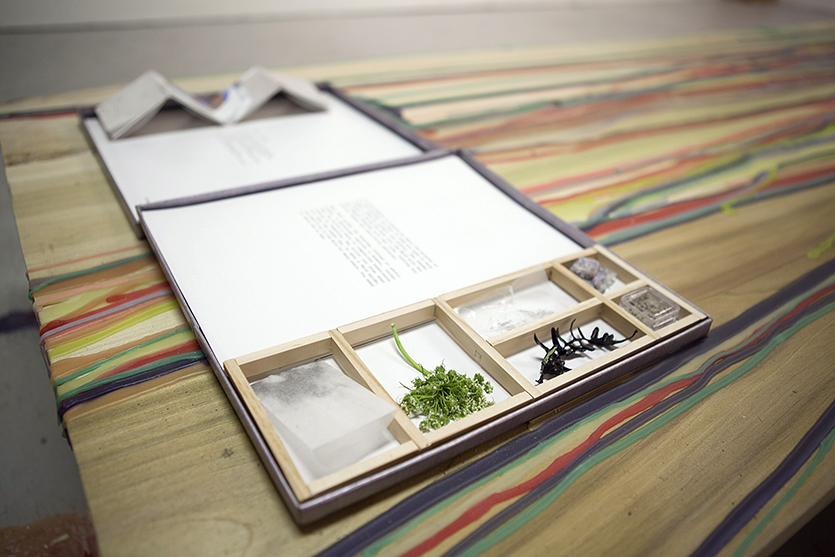 We even agreed on a format for the field guide: appropriated record boxes with field samples of the materials that were important for her work placed in compartments built into the boxes, and the text of the field guide inserted as loose pages inside.