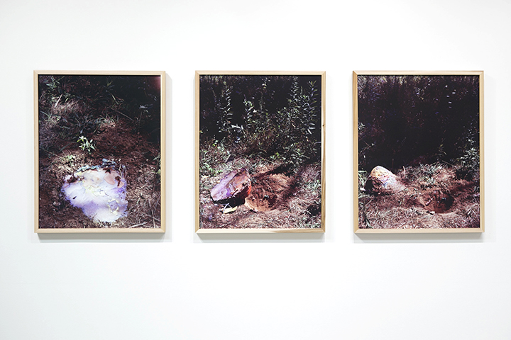 Installation view of Reasons to Cut Into the Earth, with photograph of Heidi Norton by Eileen Muller. Photograph of exhibition by Melissa Fischer.