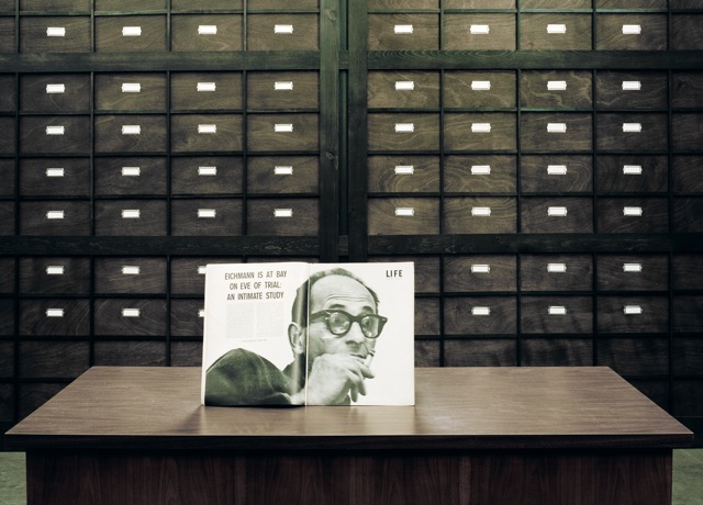 Archival remediation and revision forms the basis of three more recent works, the last of which is currently on view at MoMA, 9 Scripts from a Nation at War. In Evidence (Criminal Case 40/61), Geyer revisits the trial of Adolf Eichmann. Placing a series of objects related to the trial on a table in front of a wall of archive boxes, her photographs foreground the materialiaty of these objects, how they would seem undeniably particular and yet ciphers for historical inscription. In Comrades of Time, seven of Geyer’s friends re/enact writings and correspondence from the era of the Weimer Republic. As the artist explains, “Through this Brechtian rupture the artist is able to build a space of reflection where an individual internalisation of historical and political knowledge takes place.”