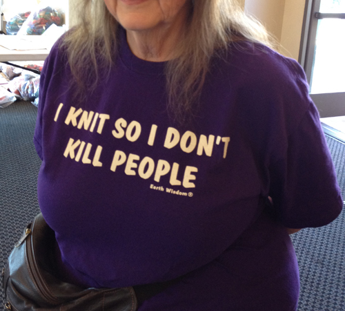 A blond lady with glasses wore a sequinned purple baseball cap and a matching purple shirt that read, “I knit so I don’t kill people.” I’m not confident that the two are mutually exclusive.