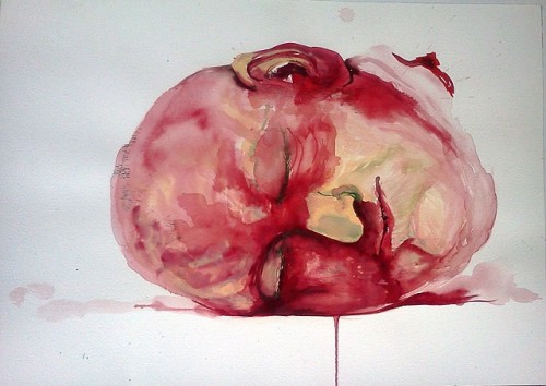 Bodily fluids and functions figure often in the things she’s made. Blood, hair, skin, crotches, limbs wrapped around other limbs, they all form her subject-matter. Overwhelming feelings color so much of what she does. It sometimes makes looking at the work an uncomfortable experience. Like we’re seeing something that wasn’t meant for everyone to be looking at.