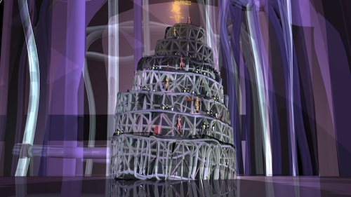 In Country Ball 1989–2012, Appendix, a new performative video and 3-D animation from artist Jacolby Satterwhite, cakes are not delicious desserts but strange architecture. Some spiral up like Towers of Babel and their tiers serve as platforms for performance: Satterwhite appears on top of them — in multiples of himself — posing, swaying, bouncing, voguing. Other cakes peak like roller coasters and add to the general spirit of amusement park here; a phallic carousel slowly rotates at the center of this cakescape. In one scene Satterwhite werqs a “cake runway.” Occasionally, his body spurts neon-colored fluids. It’s unclear what these substances are but breast milk, cum, and frosting can’t be too far fetched. Cake is one of many pleasures in this sort of queer candy land, where idealized male bodies toil and play alongside the artist. What’s most extraordinary about this world Satterwhite has created is how his family figures into it.