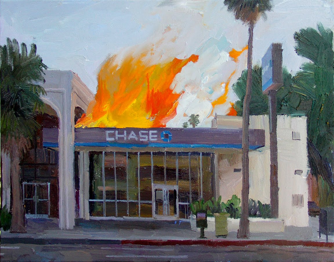 Ben White. "Thomas Jefferson Sets Himself on Fire in the Parking Lot of the Blockbuster Video Near The Creation Museum," 2010. Acrylic and spray paint on panel. Courtesy Blythe Projects, Culver City, CA.