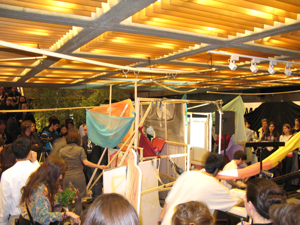 Similarly, value definitions were consistently undermined: many of the performers were recognizable artists themselves, and the boundaries between script and spontaneous action and dialogue were indecipherable, problematizing definitions of authorship. Nothing of conventional material value was created through this process of the installation, even through the potential to do so existed within many of the actions. The auctioned cereal box compositions came closest, but since they were made of carelessly torn cardboard, they still served more as supports for action than actual objects of value. In fact, by the end of the performance the entire set had been deconstructed, leaving one with only the memory of certain compositional moments,where the disparate objects and actions coalesced into a seemingly complete aesthetic construction, only to be rearranged in the next instant.
