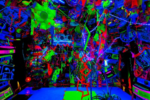 KS: I started doing it a long time ago, probably around 1981. I had this this weird place right near Bryant Park back with Keith Haring then, it was very funky. It wasn’t a loft. It was an 1820’s townhouse that had never been repaired. It was stuck between these buildings in Midtown. I discovered this room in this rambling house. It was so filled with junk that you couldn’t even get a foot in the door. I thought, “Okay, I have a new space here.” So I emptied it all out. It had old wallpaper and was all funky, abandoned and cool. I don’t know exactly how I stumbled on a blacklight. I was walking and I saw a blacklight and thought, “I need that.” I put it in the room with a poster and combined it with all the junk I had just took out of the room. This was all connected to my fascination with junk and garbage. I had been making art out of trash for awhile before that. I like appliances and things with dials and toys, things I can transform into these science fiction/fantasy objects. I started throwing the junk in the room and painting it fluorescent with the blacklight. So, it all grew from there.