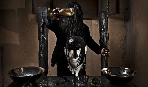 Previous articles and interviews with Nader conducted by Invisible Oranges, NPR, and Vice have largely focused on his collaborations with iconic Metal musicians (whose mythic careers Nader has also deliberately folded into his concept for the In the Flesh project) and his masks for Attila’s stage performances. Although Nader uses music as a medium, he does not describe himself as a musician. (Nader directed the sound of In the Flesh, but his actual part in writing the compositions was minimal.) Furthermore, his work with Attila is only part of his ongoing mask projects. In order to emphasize and contextualize Nader’s artistic decisions, I’ve decided to focus here on the virtual lexicon that he is building as he infuses objects—such as petroleum, the guitar, hair, and sulpher crystals—with new meanings, values, and ritualistic powers. So, without further ado: