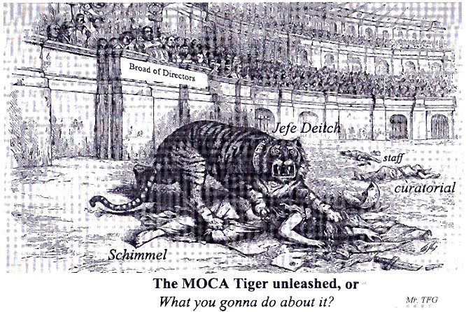 This weekend, when the Sunday paper came, there was an editorial by Eli Broad, a billionaire and lifetime MOCA trustee, by far L.A.’s biggest art-focused philanthropist. It was right below a piece on Hilary Clinton’s diplomatic track record and titled, “MOCA’s past and future.” Broad wrote about Schimmel’s “resignation,” said everyone knew Schimmel was a brilliant curator, then vaguely implied that shows under Schimmel really had not been cost effective – he was vague about Schimmel’s implication, that is, not about the fiscal part. Broad said, “I applaud the decision of MOCA’s director, board leadership and board in right-sizing the staff and adopting a budget that they expect will be balanced in the coming year and in future years.” He also defending his 2009 hiring of populist Deitch and said, “In today’s economic environment, museums must be fiscally prudent and creative in presenting cost-effective, visually stimulating exhibitions that attract a broad audience.”