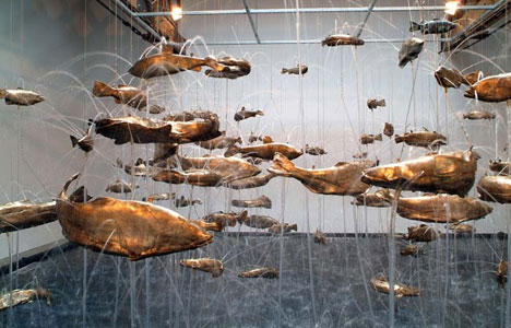 - Bruce Nauman’s One Hundred Fish Fountain will soon be on view at the Gagosian Gallery (NYC). This sculpture, one of the largest artworks the artist has ever made, is a functional fountain comprised of 97 bronze casts of fish that are suspended throughout the air that noisily shoot water out of their mouths into a large basin below, occasionally coming to a complete halt. Robert Ryman‘s A Painting in Four Parts will also be on view at the Gagosian. Both shows will run July 30 – August 24.