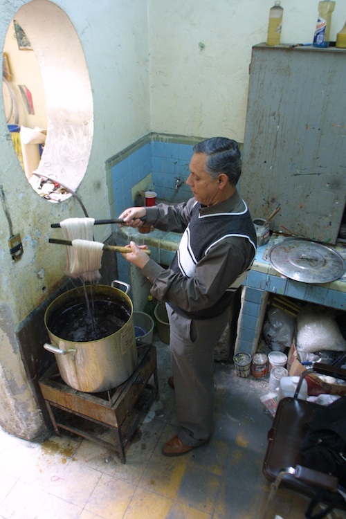 As for the entire process employed at the Taller, Rafael and his brother Leopoldo demonstrated how the wool is dyed, measured, woven, and finally, mounted onto another piece of fabric. They use synthetic dyes, since they are better able to achieve the desired colors with these materials. When weaving, they employ about three threads per square centimeter, significantly fewer than the thirty threads that were used in the past and that some workshops still employ. (Most operating workshops use three threads).