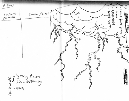 FC: No, I had no idea if the photo would even turn out, since the film had not been processed at that point. It was brought up as a possible cover image while the album was being mixed in Seattle, and everyone involved chose that photo for the cover. That drawing was done by Aaron. We were all talking about the storm in the studio in Chicago.