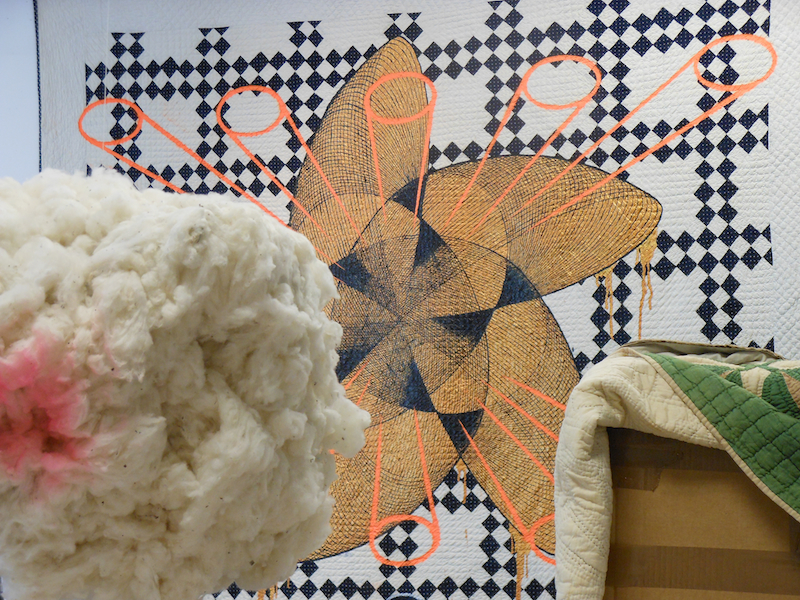 Sacred geometry (geometric design) and raw cotton “clouds” figure into his work, as seen in another quilt I saw him working on this week. Here, you can see Julie Mehretu‘s influence, as well as other motifs seen in Codex such as Lotus, Biggers’ “highly stylized,” twenty-four-petal filigree pattern in the shape of a flower.