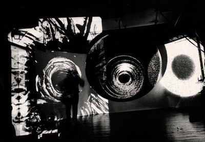 I was friends with the black poets [Ishmael Reed and Norman Pritchard], and I said, “I want you to read poetry.” […] I was making slides [lumagrams], large slides to project, and they were all hand painted and black. I said, “Maybe when you do the poetry, I’ll do some projection and we’ll make a performance.” That’s how it started. And it was called Black. […] Black also had a dancer, Carla Black. […] And the performance went very well and somebody saw it […] and said “I’d like you to do this again Aldo, in a small theater in the Lower East Side,” which was called the Bridge. So I did that. And every time I did Black I changed it. It became like a work in progress. And this went on for a long time, and each time it changed. One time it was called Black 2 and I had a big article in the Herald Tribune from New York, and the article was called “Rebellion in Art Form, Tambellini Black 2.” I’d always have an avant-garde jazz musician, never played melody at all, just very far-out improvisations.