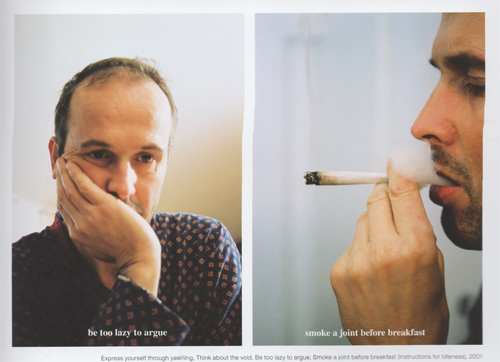 So, how do we as artists escape ourselves to have this For the Roses moment? This brings me to Erwin Wurm’s image with the subtitle Think About the Void (in his series Instructions for Idleness). When compared to the other sentiments in his series, like Stay in Your Pajamas All Day or Express Yourself Through Yawning, we are able to arrive at a sort of tongue-in-cheek existentialism. Yet taken on its own, Think About The Void doesn’t seem so far from the truth–picture hoards of MFA students desperately trying to find peace by staring out the window for hours on end. Artists are constantly trying to distract themselves in order for their brains to arrive at their next idea, or a solution to a problem in the studio. Artists drive, take showers, swim, or have sex as a way to occupy the body with one task, while allowing the mind some freedom to roam.