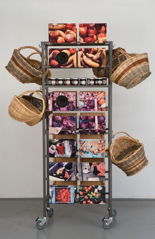 Lucy + Jorge Orta’s Food-Water-Life installation at Tufts University Art Gallery, 2012. Left: “Mexican Kitchen,” 2002-2008. Right, rear: “HortiRecycling Enterprise, act II–Conservation Unit,” 1997-2005. Photo: Alonso Nichols, Tufts University Photography.