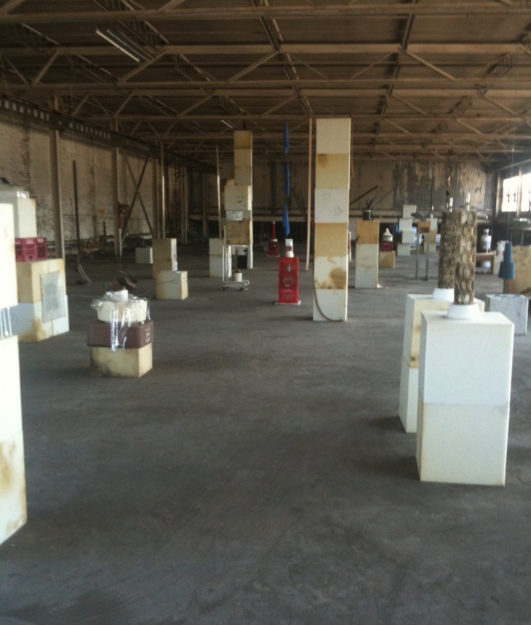 The building itself was immense and exceptionally dirty. Water leaked from rusty faucets and tarps flapped against broken windows. Overhead the skylights hung in brittle shards where a hailstorm had smashed the glass several months before. Artists used the materials on site to create works, which they then installed in a variety of strategies. Black created a still life installation under a trip light that flashed on when someone walked passed. Mike Schuh composed a series of on-site sculptures, where he repositioned certain objects in combination with one another, almost like the stacks of rocks you find on a hiking trail. However, you couldn’t really tell what objects he’d organized together, and what objects happened to be that way before, or after his intervention. “Nothing I did for [Part One] is identifiable,” Schuh said about these works, “because it was intentionally done in such a way that I could not recall what I did and therefore could not share it with anyone.” Since objects were constantly getting moved around over the course of day’s work, what sculptures Schuh did create could have been moved before Part One even opened. Laura Davis salvaged a series of foam rectangle packaging and installed them like plinths on an upper mezzanine. Baker constructed roving paper sculptures that clung to the wall like dense and colorful webs. In all of this, Lund successfully used the warehouse as a frame; the viewer had to walk through that site and actively decipher works of art from what might otherwise be considered trash. The whole context, meanwhile, pointed to a greater network of economic production, especially what remains unsold and eventually becomes useless.