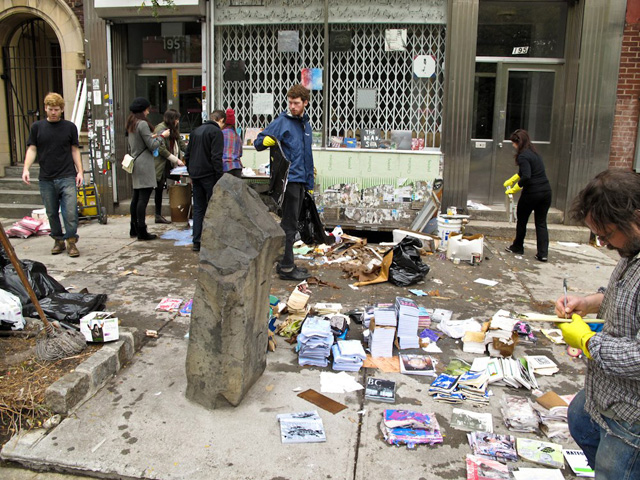 Printed Matter cleaning waterlogged works outside its storefront in Chelsea. Image via Hyperallergic.com.