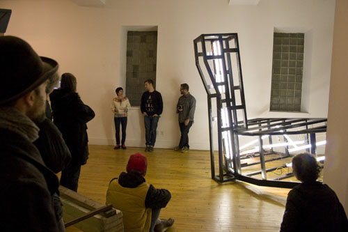 Artist Melanie Manos moderated their talk at 2739 Edwin, scheduled concurrently with the closing night of their exhibition “Drifting Towards Consequence.” In this collection of works, Sebura&Gartelmann explore fundamental aspects of human relationships through the construction of perfect, but slightly odd, vernacular architecture and absurd actions that test the boundaries of their mutual trust.