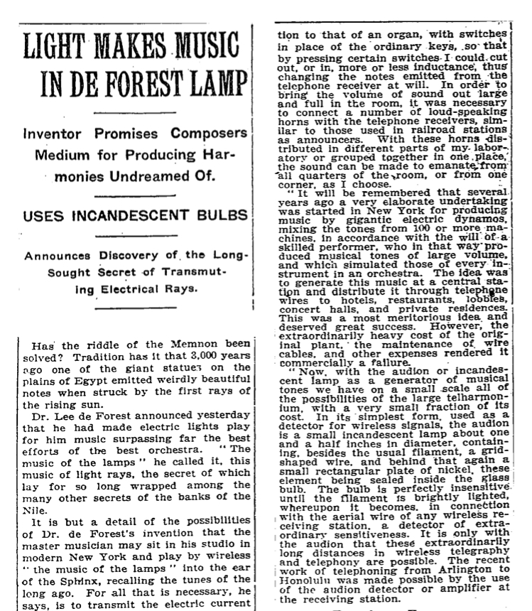 Detail of the article “Light Makes Music In De Forest Lamp,” printed in the New York Times, October 4, 1915.