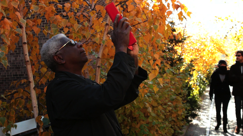 El Anatsui taking a photograph on his iPad of “Broken Bridge II” (2012) installed above the High Line in New York City. Production still from the series Exclusive. © Art21, Inc. 2013. Cinematography by Ian Forster.