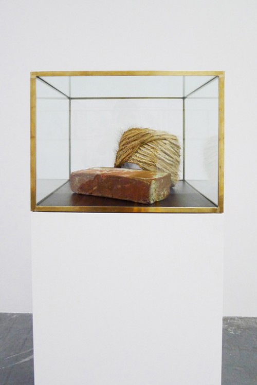 The REDCAT exhibition features banners stitched with slogans that comingle messages and images inspired by and appropriated from the Iranian revolution and the Polish Solidarity movement. “Help the Militia, Beat Yourself Up” is meant to invoke the sanctuary provided by mosques and the Catholic church within the two periods of unrest, or a Farsi translation of the Polish Solidarność slogan “Only solidarity and patience will secure our victory.” Behind the flags are sculptures, including Wheat Molla, which integrates the communist symbol of wheat ears into a Molla turban–a symbol for radical Shi’a resistance–placed behind a brick meant to symbolize the Polish labor movement. Encased in a vitrine, these objects, together, form an imaginary relic.