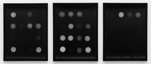 Mays left Chile with a new body of work entitled Sun Ruins, which she exhibited in the fall of 2011 at GOLDEN Gallery in New York. This body of work is comprised of two parts: First, Mays took some of the archival photographs from the Chilean astronomical observatory and in one series arranged 25 silver gelatin prints to show the sun’s progression in 1957. For the second part of the work, Mays punched holes in the photographs, rendering the stars invisible, and commenting on the ways in which stars move—faster than our fast-paced technology can document the fiery bodies.