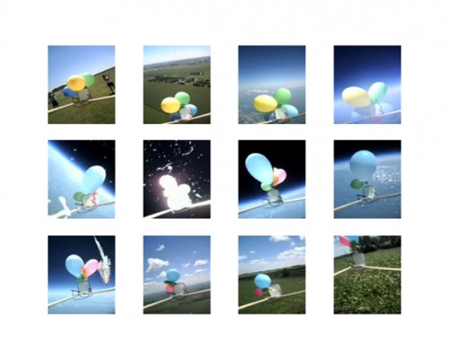 Mays worked with the 47th Annual AstroScience Workshop at Chicago’s Adler Planetarium to recreate Larry’s journey. She made a tiny Larry lawn chair replica, attached to it helium balloons, and sent it sailing sans human. The sculpture reached 96,000 feet before the balloons popped and it all came tumbling down. Mays attached a video camera to the piece, documenting its entire journey into endless blue.
