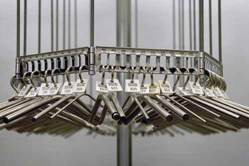 Mungo Thomson, “Coat Check Chimes,” 2008. Nickel-plated aluminum and steel, dimensions variable. Installation view, 2008 Whitney Biennial. Photo: Joanne Kim.
