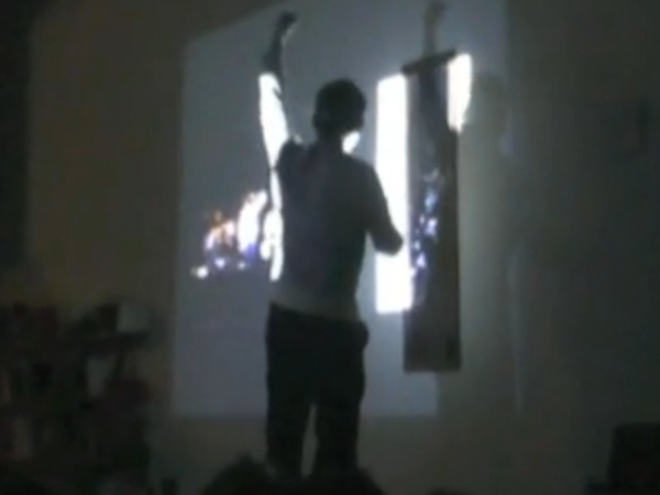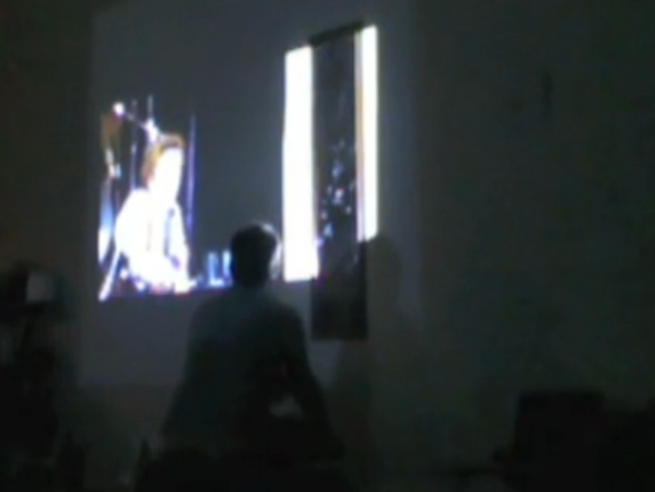 A video of the Pistols performing the Stooges’ “No Fun” is projected on the wall. To the right of the frame a vertical strip of white light is projected on a mirror. As Johnny Rotten takes the stage, I leap onto a table, framing myself in the strip of white light and facing the mirror, while I mimic Rotten’s gestures and movements. Adopting Dan Graham’s style, tone, and some of his phrases, I narrate Rotten’s movements in the first person, throughout the seven and a half minutes of the song.