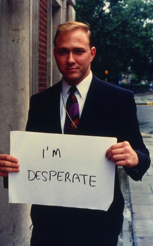 So too does Gillian Wearing’s photograph I’m Desperate, taken during the depths of a global recession in the early 1990s. Asking passersby in the Regent’s Park section of London to write down their thoughts on a sheet of paper and then photographing them with it, Wearing produced a set of searing images that are as much an emblem of 2013 in the wake of the so-called Great Recession as they are of 1993.