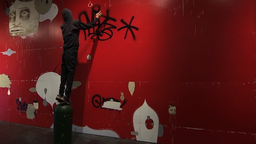 A mannequin tagging on Barry McGee’s “Untitled” (1999/2012). Production still from the series Exclusive. © Art21, Inc. 2013. Cinematography by Bob Elfstrom.