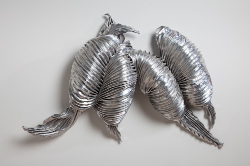 - Lynda Benglis‘s work is on view at the Locks Gallery (Philadelphia, PA). Everything Flows features, among other works, the artist’s Pleat pieces. For these, Benglis manipulated fragments of folded mesh and sprayed them with liquid metal. The results are “buoyantly, ebulliently, kinetically fluid-like giant, festively crinkled, artlessly tied bows undergoing their various twists, turns and knots,” writes art historian Anna Chave in her accompanying essay. The exhibition closes June 15.