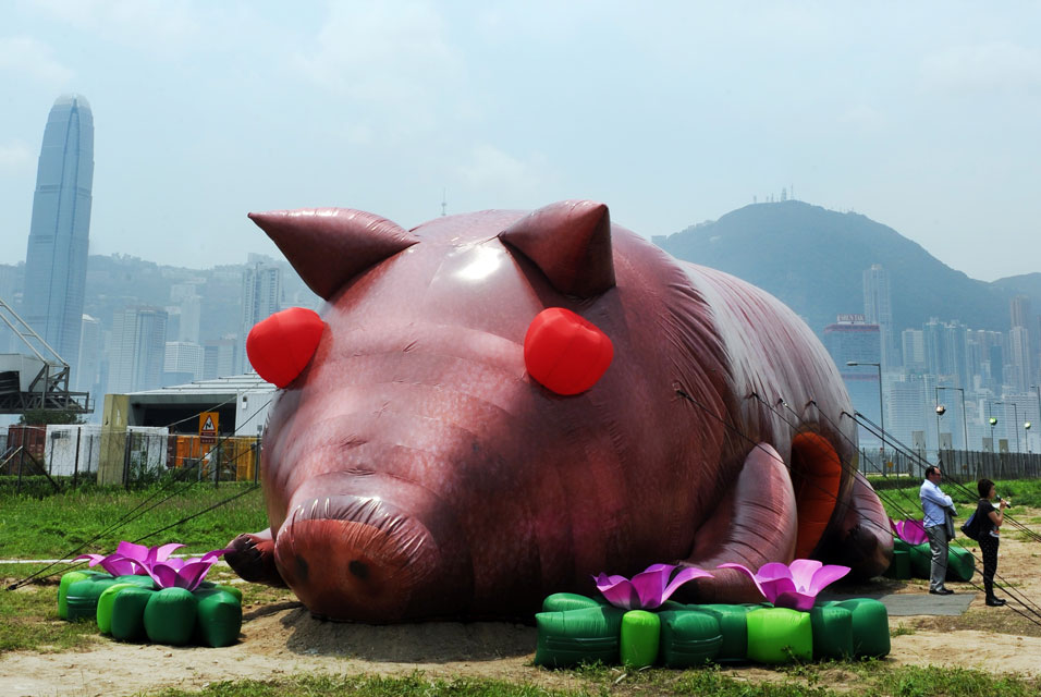 - Cao Fei installed a giant inflatable pig sculpture on the Promenade at West Kowloon (Hong Kong). House of Treasures is meant to be light-hearted while exploring the roots of its projected aura of fun. The work is on view through June 9.