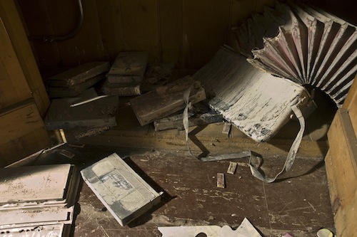 He would be right. Mekkelson imbues objects with an artificial memory. There was never any flood in this room; prior to their experience in Mekkelson’s studio, all of the objects were brand new. The distress they wear is therefore artificial, and yet once one draws that conclusion, the fabrication of distress becomes newly fascinating. Mud, dried in drips transforms a paperback book into an abstract composition. Each object, carefully rendered offers a unique meditation on corruption. The line of the watermark around the room boasts a bizarre authority—tying the mess together and thereby suggesting the inner logic of this still life. And is this kind of illusory composition so different from the exercise of perspective in a realist painting? Except in this case the art does not recreate a “real” scene (via painting or photography, for instance). Instead, Mekkelson’s “sculptures” must consume and destroy the real things they once were in order to become art objects. Once-useful objects must be rendered useless in their transformation into art. By firmly creating a sensation of flux—a room before it is put back together—Limited Entry suspends time. One’s ability to return to this room again and again over the course of the exhibit gives the viewer access to typically ephemeral, disembodied and often desperate moments of crisis. To contemplate the ensuing desire to move on and get things back to their proper place. To clean up the mess. Again, what might especially aggravate our landlord—a man who by his very profession hastens to maintain and fortify domestic security.
