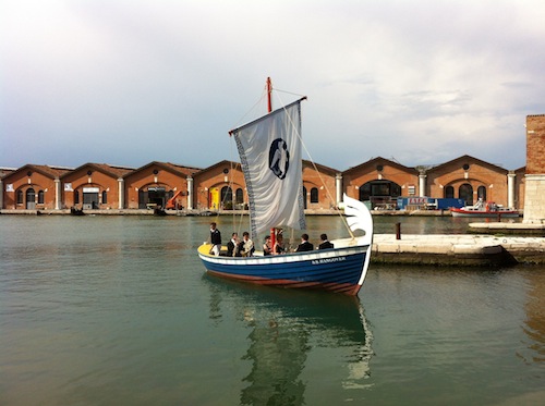 Ragnar Kjartansson’s S.S. Hangover, a repurposed Icelandic fishing boat, in which a crew of tuxedo-clad musicians played a composition for brass instruments while ferrying the boat from one dock to the next in a procession that recalls the sixteenth century Venetian tradition of floating Theaters of the World. Photo: Natalie Musteata.