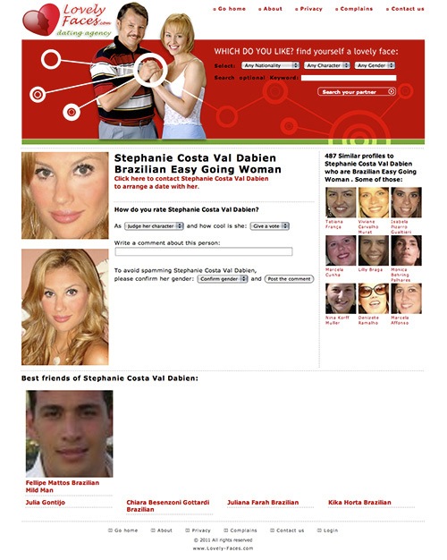 On February 2, 2011, Italian-born media artist Paolo Cirio launched the website Lovely-Faces in collaboration with media art critic Alessandro Ludovico. Lovely Faces had a five-day fling as a dating website, but unlike other sites of the matchmaking sort, users were unaware of their participation. Cirio made the profiles by secretly harvesting pictures from Facebook using a script he had created.