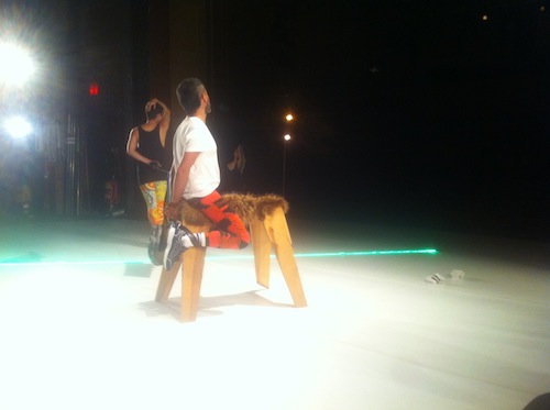 After a walking tour through the back stairwell of the theater, the audience sat on stage with the artists. As the performance began, the artists posed against electric glamour—neon, fur, leather, lights, and a large mirror. Betancurth sat on a rocking horse with a muzzle. Romero stood. As the lights grew brighter and the bass of the music grew deeper, the tableau intensified but quickly descended into the mundane. The audience was asked to help Romero roll and then unroll Marley dance flooring to no consequence.