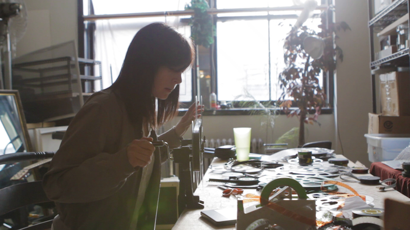 Artist Martha Colburn transfers film from reel to reel in her home and studio (Long Island City, Queens, 01.15.11). Production still from the New York Close Up film Martha Colburn Cuts the Boring Parts Out. © Art21, Inc. 2011. Cinematography by Michael Tyburski.