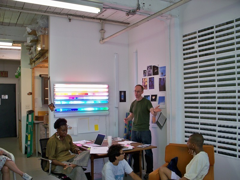 Artist Spencer Finch in his studio introducing teens to his Highline project The River That Flows Both Ways (2009).