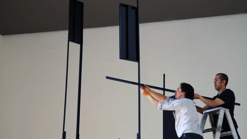 Artists Alejandro Almanza Pereda and Alfonso Zárate assemble metal shelving for the sculpture At the palace in the air at 4 am at Museo Experimental El Eco (Colonia San Rafael, Mexico City, 08.17.13). Production still from the New York Close Up film Alejandro Almanza Pereda Strikes a Balance. © Art21, Inc. 2013. Cinematography by José Pablo Escamilla & Daniel Loustaunau
