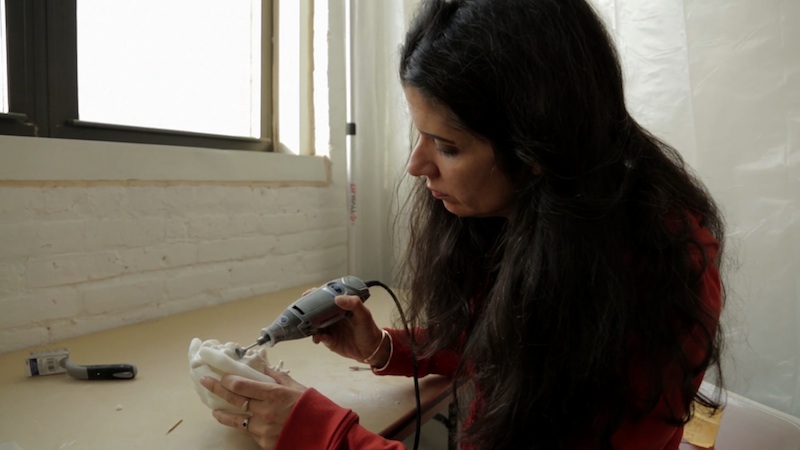 Janine Antoni sanding a milagros-inspired sculpture in her Brooklyn, New York studio. Production still from the series Exclusive. © Art21, Inc. 2014. Cinematography: Rafael Salazar