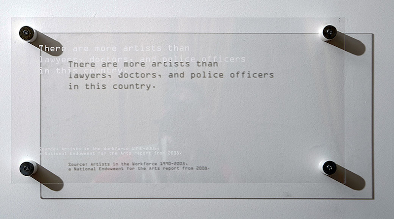 BFAMFAPhD is an open-ended project that endeavors to unite artists in order to address the problems of their rising population in this country. The application form to join the project (available on the project’s website) states that this ongoing research and organizing initiative “visualizes the number of students graduating with creative degrees, generates dialog about our collective power, and elicits proposals for organizing efforts.” If artists opted to put their money into cooperative loans rather than tuition, this capital could be pooled for the benefit of the community. Moreover, if schooling were free, as it is in many countries abroad, artists might be granted the financial liberty to focus on politically engaging and provocative work instead of feeling pressure to create sellable, sometimes conservative, work. The initiative, its website, and its related installation and talks at the Queens Museum of Art aim to raise awareness about these issues.
