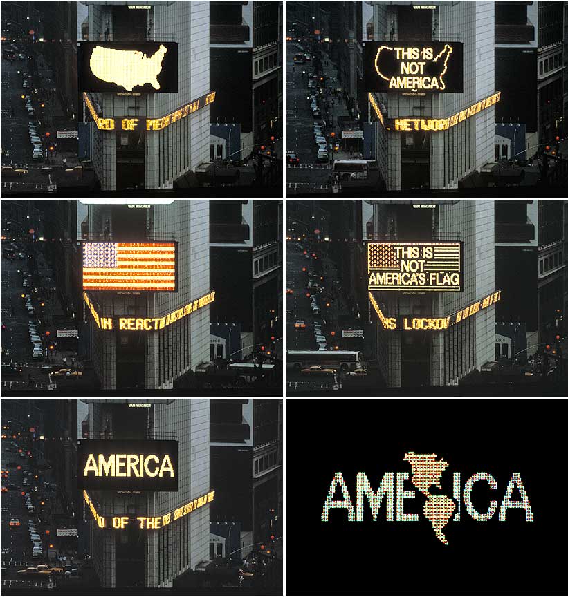 Alfredo Jaar. A Logo for America, 1986. Public intervention at Times Square, New York, USA. Courtesy Galerie Lelong, New York. © Alfredo Jaar