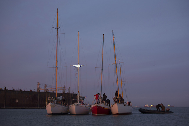 These questions came to mind during my first visit to Treasure Island. I was there with with my new husband and some new friends. I had been invited by SoEx to participate in Constance Hockaday’s work, All These Darlings and Now Us (2014), a floating peep show. I use the word participate loosely; we were there to perform the role of voyeur, a lurid synonym for spectator. From a crab shack where we registered our arrival, we hiked to a beach where we were transported by inflatable boats to four other deteriorating sailboats, lassoed together by nautical ropes. My companions were a bit sheepish, but I was enamored of the experience. The performers were cut from Bay Area cloth: trans, queer, all body types, bound, feathered, bedazzled, and chained. Many of them had performed at San Francisco’s Lusty Lady, a unionized and worker-owned peep-show co-op, or Esta Noche, a Latino gay bar, both of which had closed by the time All These Darlings was publicly performed. According to Hockaday’s website, more than six hundred people enjoyed the show: “art people, old guys, queers, sex workers, young professionals, and working-class sailors.”[2] Still, the performers of All These Darlings would have likely earned more in their landlubber establishments, than out at sea.