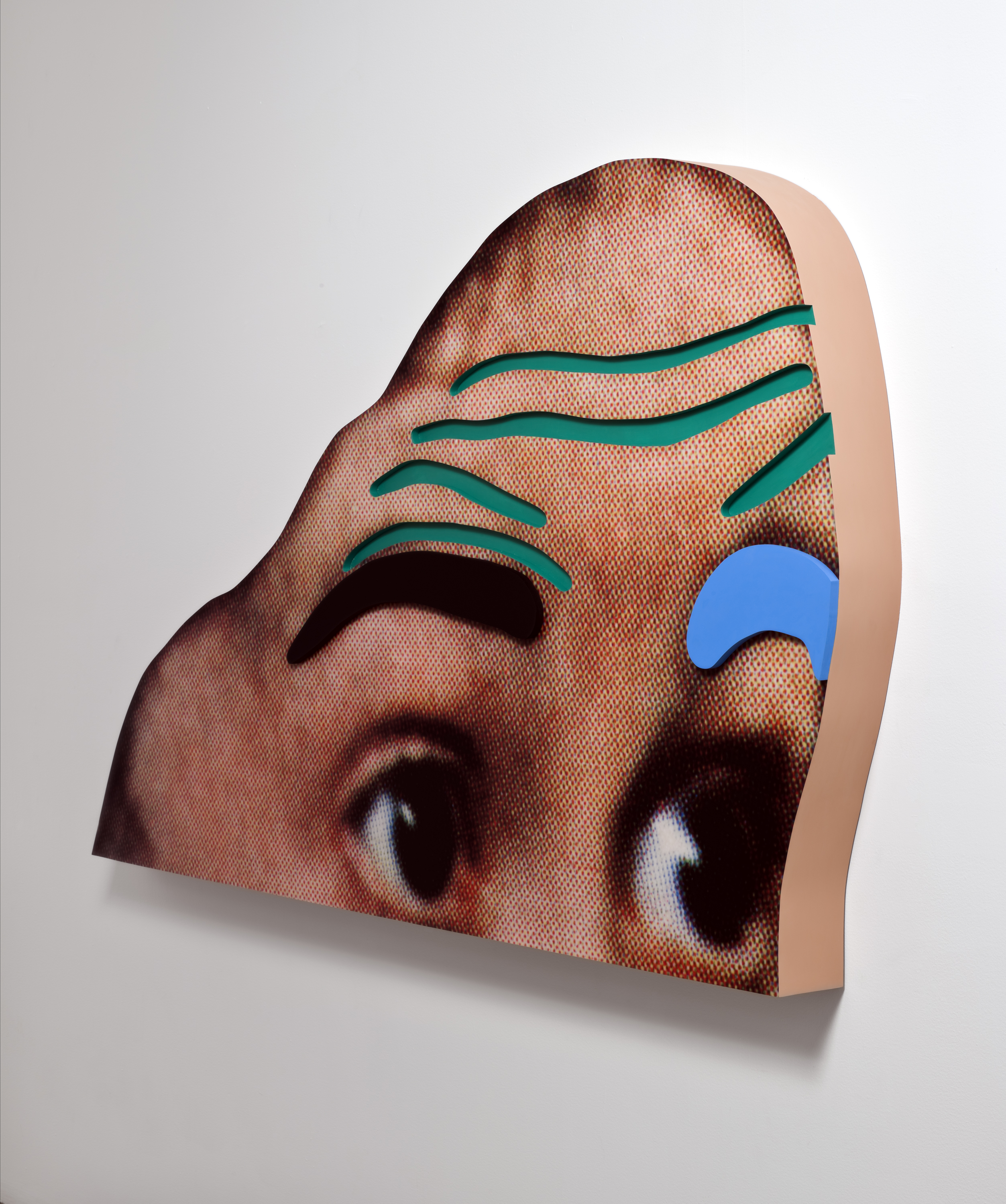 Raised Eyebrows/ Furrowed Foreheads: (Black and Blue Eyebrows), 2008. Three dimensional archival print, laminated with lexan and mounted on shaped form with acrylic paint, 57 3/4 x 102 x 6 3/4 inches. © John Baldessari, courtesy Marian Goodman Gallery, New York.